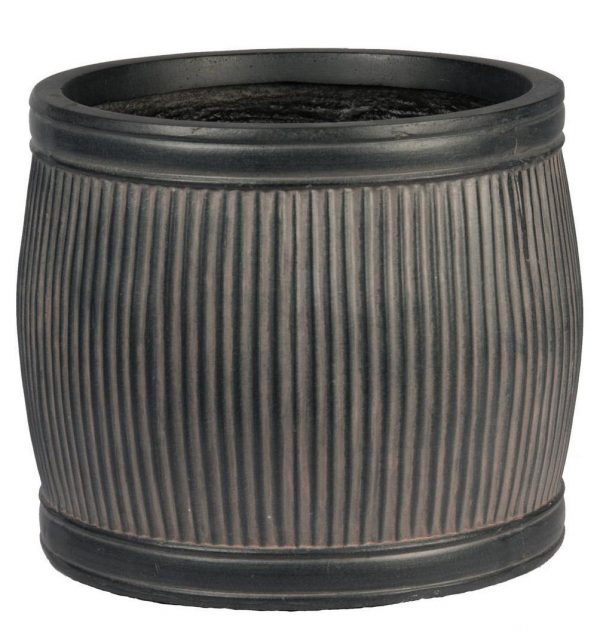 Vertical Ribbed Vintage Style Faux Lead Dark Grey Barrel Round Planter by IDEALIST Lite H20 L24 W24 cm, 9 ltrs Cap.